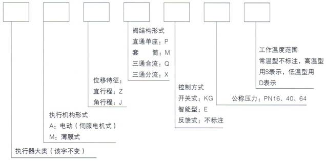 本产品型号由两节组成.第一节以大写汉语拼音字母表示产品的大类、能源、结构形式,第二部分阿拉伯数字表示产品的参数,尾注以大写拼音字母表示阀的作用形式和工作温度范围。