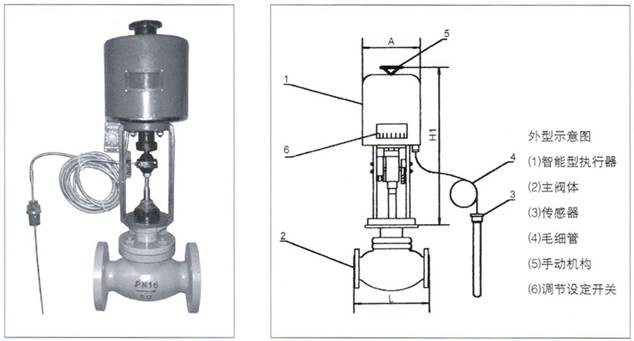 调节阀由主阀、智能执行器与传感器三部分组成,根据用户需要,分别有加热型与冷却型两种结构。