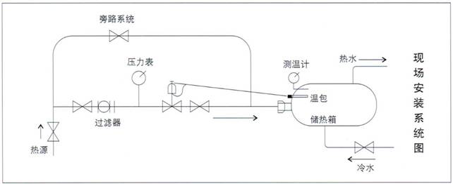 (3)为使自控系统或检修阀门时仍能连续运行,应设置旁通阀、阀前须装过滤器、压力表,在传感器附近装测温计,便于现场监视与温度设定。见下图: