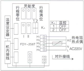 1、将温包一端的二根线接入温控器中的H1、H2接线端子,另一端的一根线接入H3的接线端子,电源AC220V的二根线分别接入H4、H5接线端子。