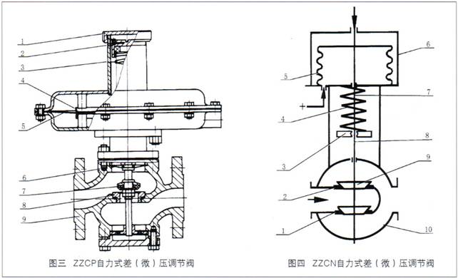 差(微)压调节阀有B型和K型两种。B型阀阀芯初始位置常开,差(微)压增大时闭合。K型阀阀芯初始位置常闭,差(微)压增大时开启。
