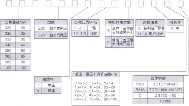 065ZZCN-10BU0/42-51P316表示阀口为65mm自力式差压双座调节阀,公称压力0.1MPa,阀芯初始位置常开,连接法兰按用户提出。无可选件,差压调节范围为42~51kPa,阀体材质为ZG0Cr18Ni12Mo2Ti。